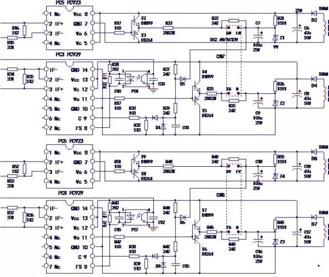 如圖2-9所示,PC5與PC6兩路驅(qū)動(dòng)IC的外圍電路的元件參數(shù)完全相同;PC3與PC8兩路驅(qū)動(dòng)IC的外圍元件參數(shù)完全相同,R17=R51、R23=R48、R22=R49……,當(dāng)PC3外圍有元件損壞壞,可以“照搬”P(pán)C5相對(duì)應(yīng)外圍元件的參數(shù)值進(jìn)行修復(fù)。